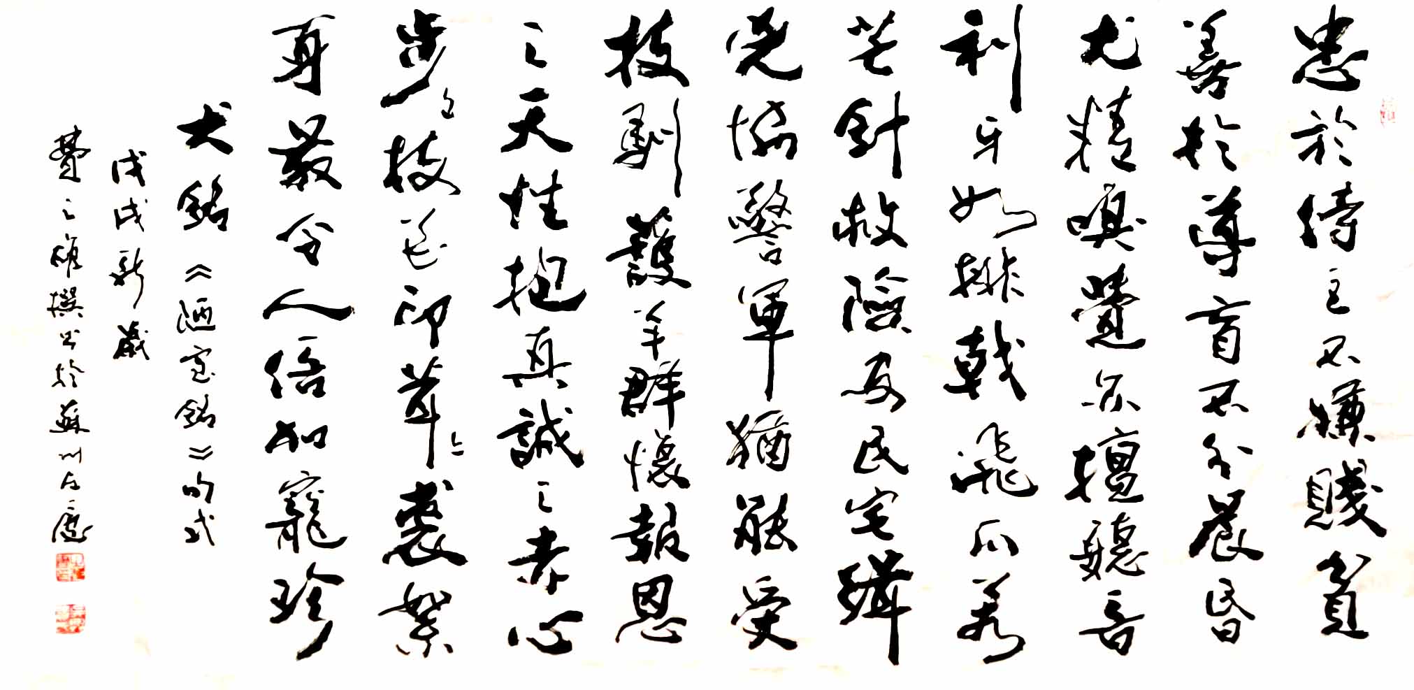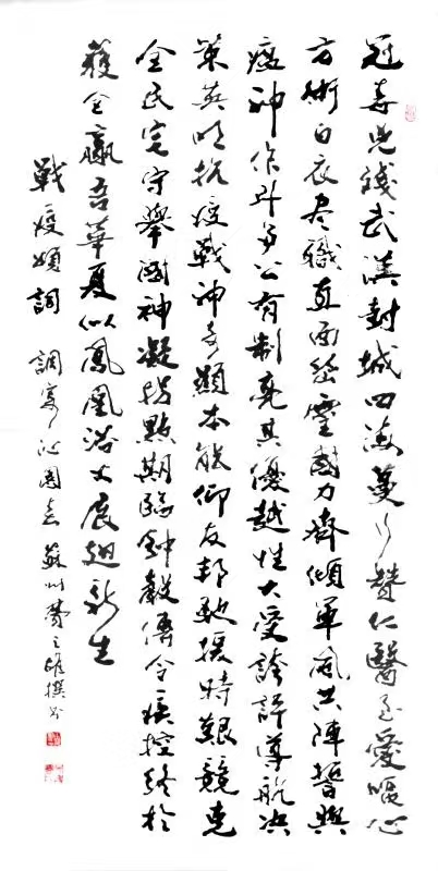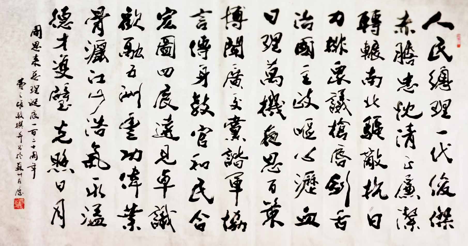 在他的书法作品中,我们可以看到对祖国繁荣昌盛的美好祝愿。例如,《奥运颂》以激情澎湃的笔墨,歌颂了北京奥运会的成功举办,展现了中华民族的伟大精神和强大凝聚力;《孙武颂》则通过对古代军事家孙武的赞美,弘扬了中华民族的智慧和勇气,激励着人们在新时代不断开拓进取。这些作品紧跟时代步伐,把握时代脉搏,反映了社会发展的主流趋势,具有强烈的时代感。