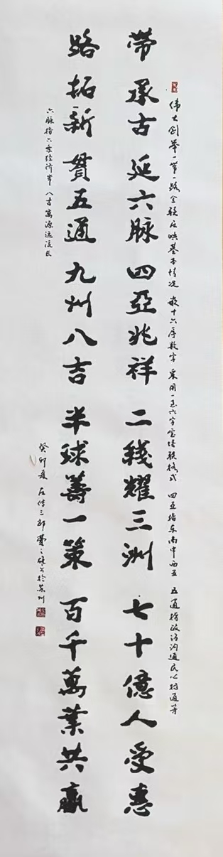 联之雄在楹联创作方面,费之雄同样展现出了非凡的才华和创新精神。他创作的楹联对仗工整、意境深远,既遵循了传统楹联的格律要求,又融入了现代元素和时代精神。他的楹联作品题材广泛,涵盖了社会生活的各个方面,有赞美祖国大好河山的,有歌颂时代英雄人物的,有反映社会热点问题的,也有表达个人情感志向的。例如,他的《一带一路宝塔联》,通过对仗工整、气势磅礴的联语,展现了这一伟大倡议的深远意义和广阔前景,具有很高的思想性和艺术性。他还善于将楹联与书法相结合,使楹联作品不仅在文字上富有魅力,在书法艺术上也独具特色,进一步提升了作品的艺术价值。