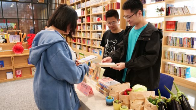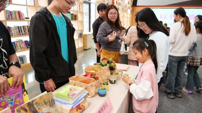 活动伊始,读者们纷纷领取“书香集章卡”,开启今天的春天之约。在“图书漂流”区域,一本本承载着知识与故事的旧书被整齐摆放在交换区,读者们可以自由选取心仪的书籍,也可以将自己的闲置好书留下,在新的读者手中继续“漂流”。以书换“蔬”摊位前更是排起了长队——茄子、西红柿、包心菜、黄瓜、土豆等新鲜蔬菜琳琅满目,还有一盆盆可爱的多肉盆栽。读者们用自己带来的旧书换取一份春天的时令蔬菜或一抹绿意,既实现了资源的循环利用,也让阅读与生活产生了温暖的情感连接。“我用一本童话书换了一棵包心菜,晚上可以做给家人吃,感觉特别有意义!”一位读者兴奋地展示着自己的“战利品”。