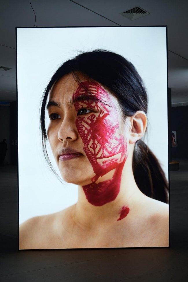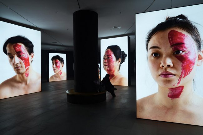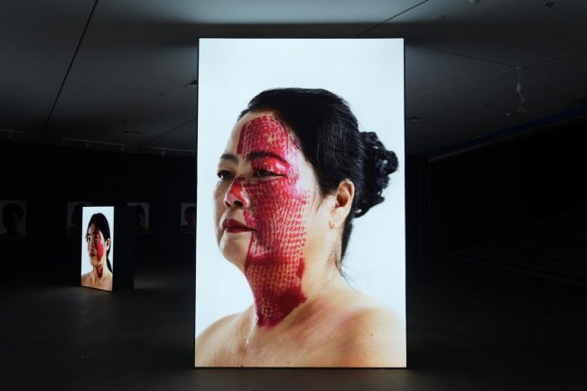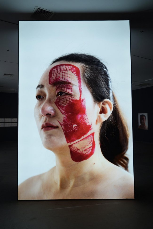 这一图景并非摆拍,而是来自一场真实发生的艺术行动。艺术家杨烨炘邀请了50个行为参与者,给每个人脸上踩上一脚,留下一个个刺眼的红色鞋印。这些鞋印的主人都是参与者生命中的重要人物,例如父母的鞋印,另一半的鞋印,前任的鞋印,闺蜜的鞋印,或者是同事同学的鞋印,又或者是领导、教授、股东、网友的鞋印,等等。